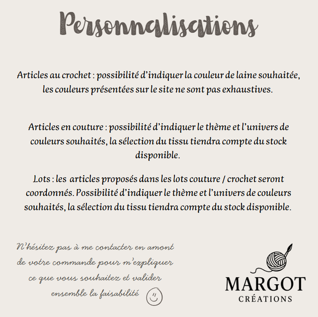 Personnalisation : vous pourrez indiquer au moment de la commande la personnalisation souhaitée : couleur, prénom à broder, dans la partie commentaires