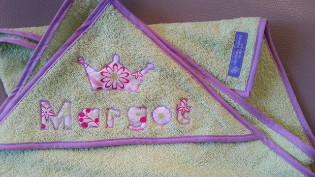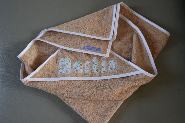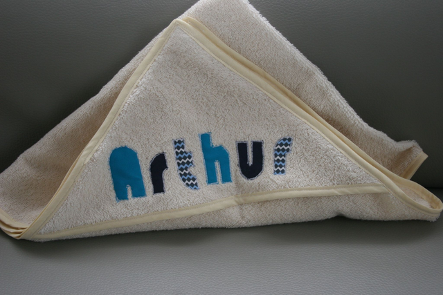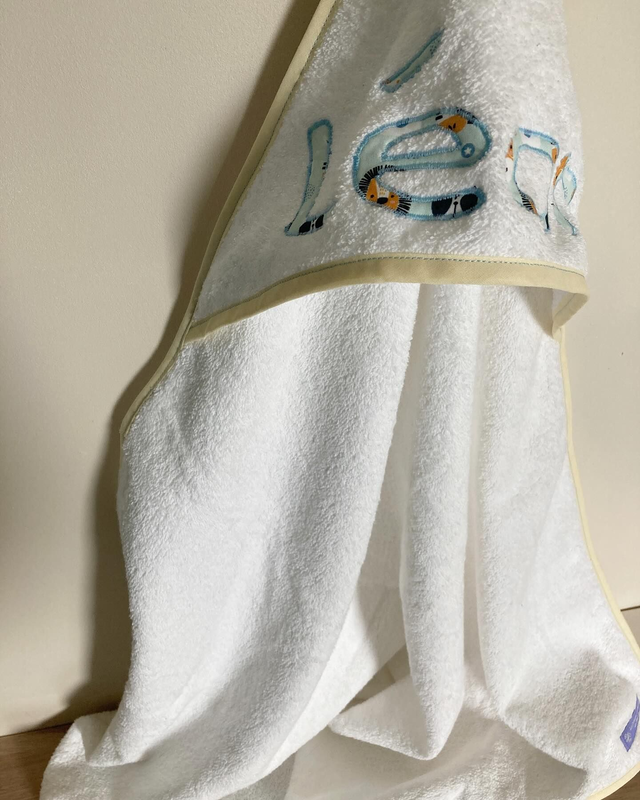 Sortie de bain en tissu éponge, capuche personnalisée avec le prénom cousu.