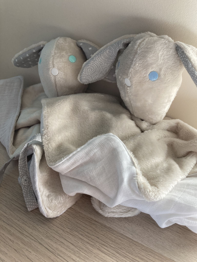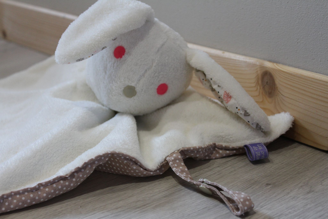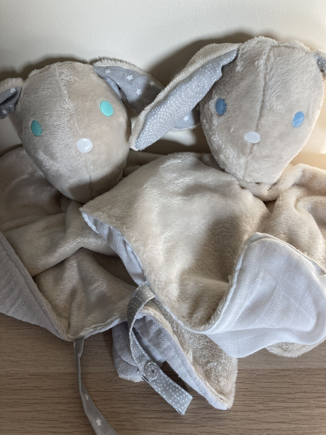 Doudou lapin en tissu polaire et lange avec ruban pour attacher une tétine.